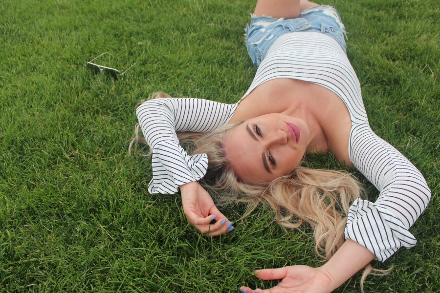 Pop of a bright color with the romper and the lips. I went for a bright firey red look, and Romy wore a soft cutesy white and blue striped romper with a hot pink lip.